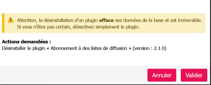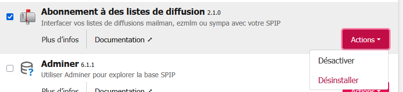 pour d’autre on a que desactiver, et il faut passer par l’onglet plugins inactif pour avoir l’action desactiver