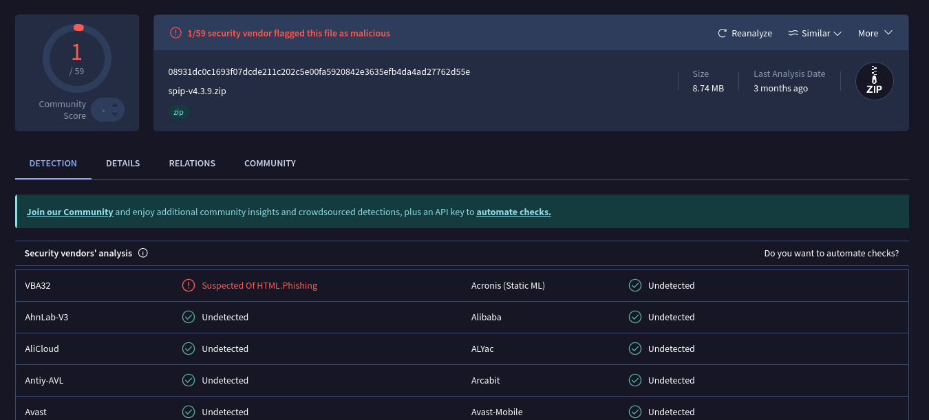 J’ai fait moi-même un ticket à OVH en référençant cette discussion … dans mon cas il s’agit d’un Wordpress dans lequel je n’ai rien trouvé d’anormal en dehors du fait qu’il n’était (pas du tout) à jour (v5.9.12) … j’en ai profité pour le mettre à jour ainsi que ses plugins et mettre en place un plugin de sécurité, changer quelques mots de passe … mais bon c’est un peu la même situation, j’ai l’impression qu’ils n’ont peut-être pas de signature pour cette version très ancienne ce qui déclenche leur outil … Bref à suivre.